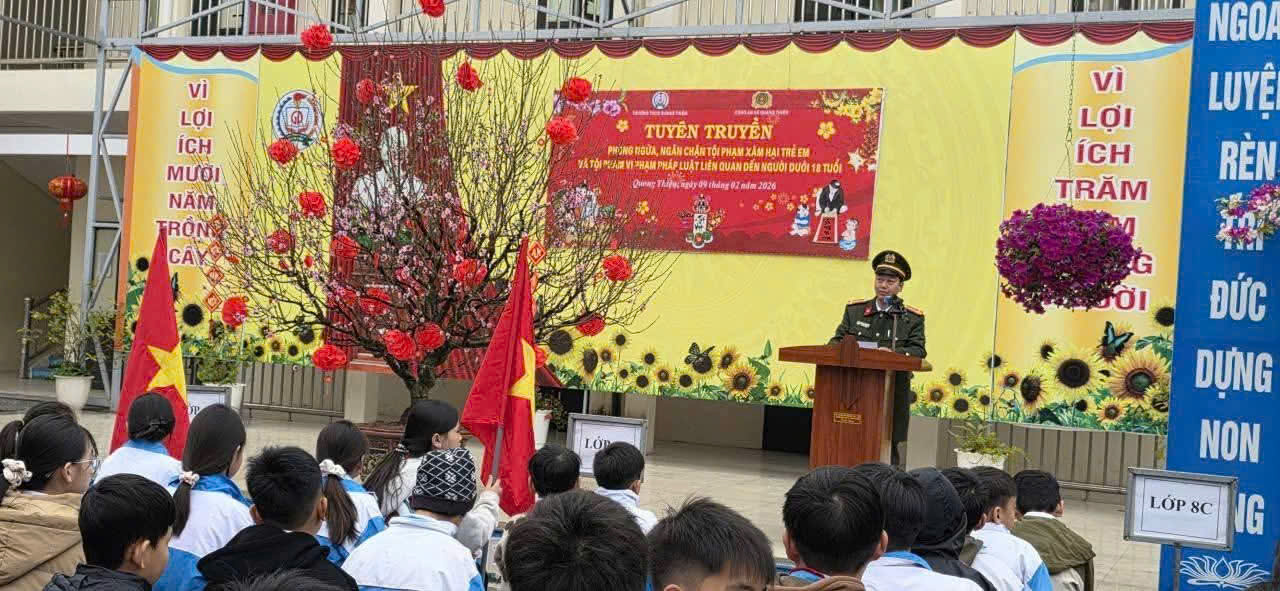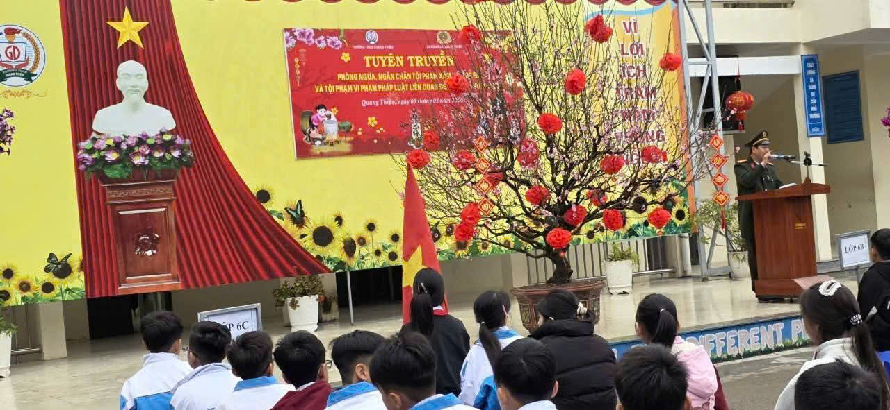 📢 Thực hiện Kế hoạch số 202/PC02-D2 ngày 03 tháng 02 năm 2026 của Phòng cảnh sát hình sự công an tỉnh Ninh Bình về việc tăng cường phòng ngừa, đấu tranh với tội phạm xâm hại trẻ em và tội phạm vi phạm pháp luật liên quan đến người dưới 18 tuổi, Trường THCS Quang Thiện phối hợp với công an xã Quang Thiện tổ chức ‘Tuyên truyền phòng, chống tội phạm xâm hại trẻ em và tội phạm vi phạm pháp luật liên quan đến người dưới 18 tuổi”vào buổi Sinh hoạt dưới cờ sáng 9/2/2026. Buổi tuyên truyền nhằm nâng cao nhận thức, kỹ năng tự bảo vệ mình và ý thức chấp hành pháp luật cho toàn thể học sinh nhà trường.